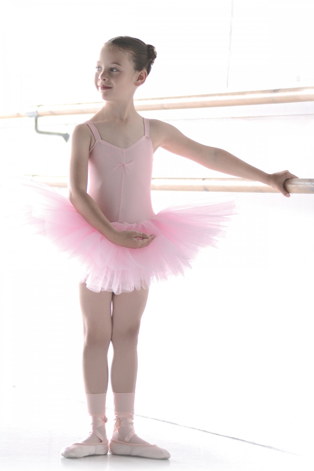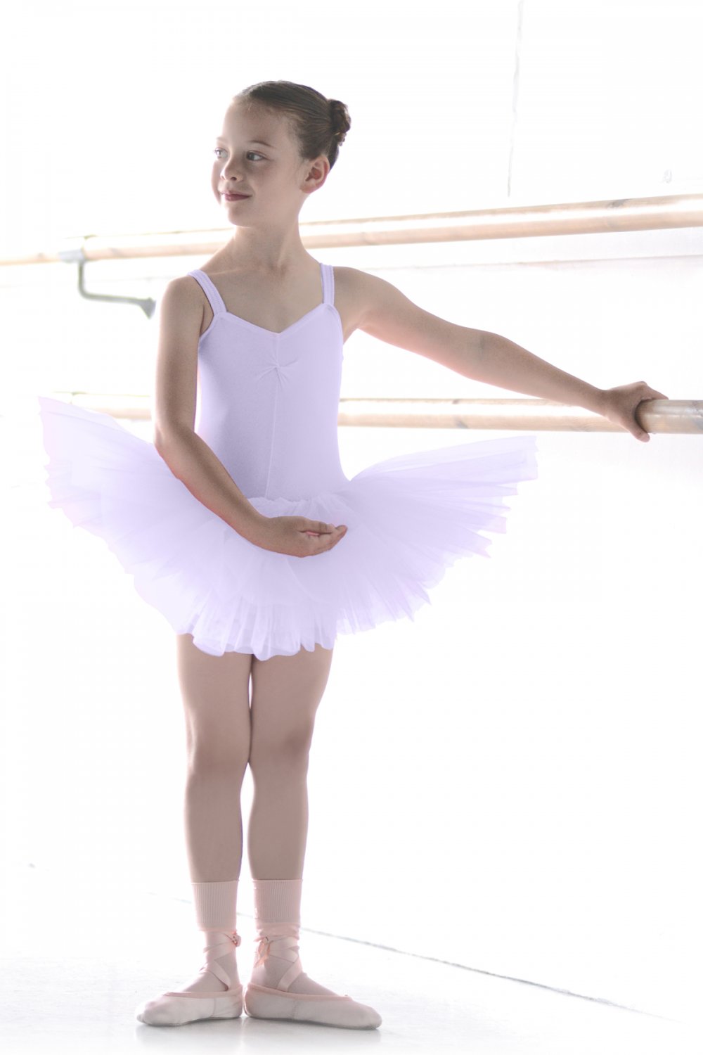 Ce tutu à la parisienne a 7 plateaux en tulle. Le haut caraco a des bretelles fines, la poitrine froncée et le dos est décolleté.