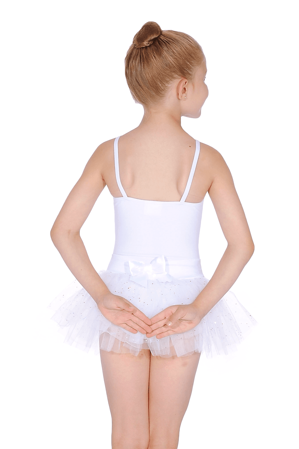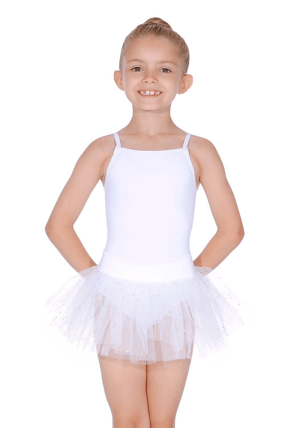 I-N9814C Capezio Justaucorps avec tutu intégré Capezio N9814C Justaucorps en coton/lycra, bretelles fines, tutu attaché, ceinture en satin et détail nud à l'arriére. Disponible en noir, blanc ou rose.