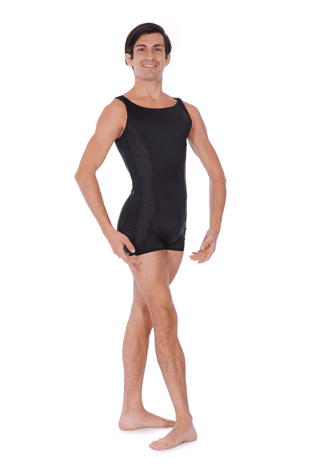 A wide neckline alongside shaped, perforated mesh panelling running down both sides of the garment gives a stylish look and enhanced line to this biketard. The ideal piece of mens dancewear.