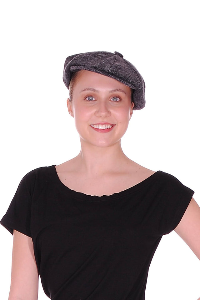 A traditionally patterned flat cap in grey. Ideal prop and costume accessory.