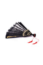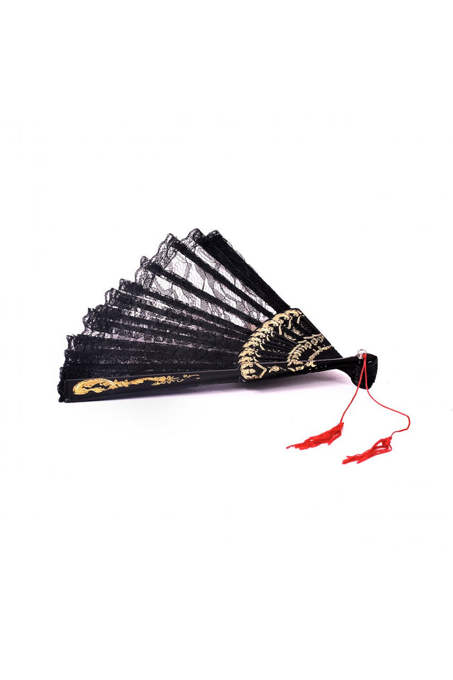 A Spanish black lace folding fan, a beautiful prop to add drama and style to your costume. Measuring 24cm in length and up to 31cm in width when fully open.