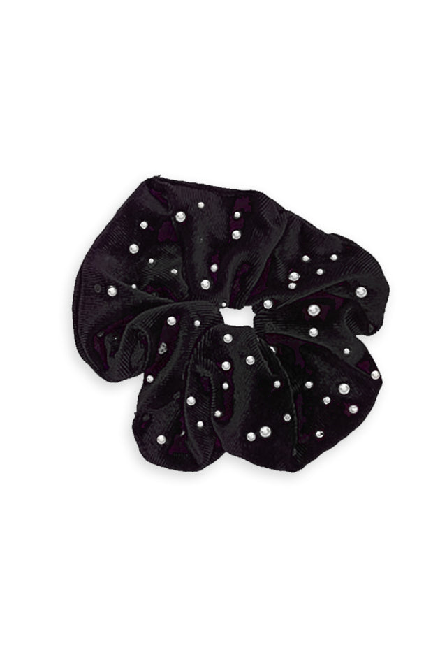 This versatile Black velour Lycra hair scrunchie is adorned with sparkling diamantes to add a touch of pazazz to any hair style. Top off your dance costumes with this twinkling hair accessory.